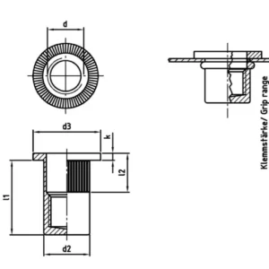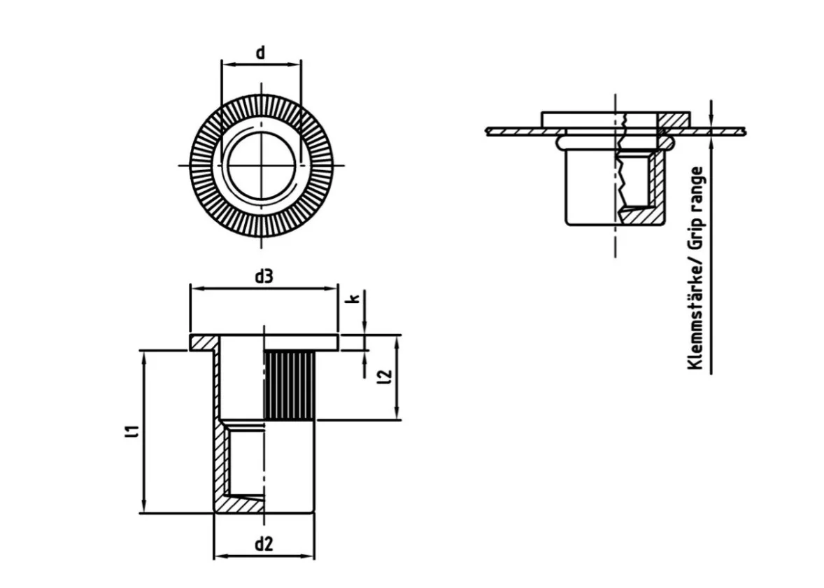 - Герметичность (Глухое исполнение): Конструкция исключает сквозной проход воздуха и жидкостей через резьбовой канал, что позволяет использовать заклепку в резервуарах и электротехнических шкафах.
