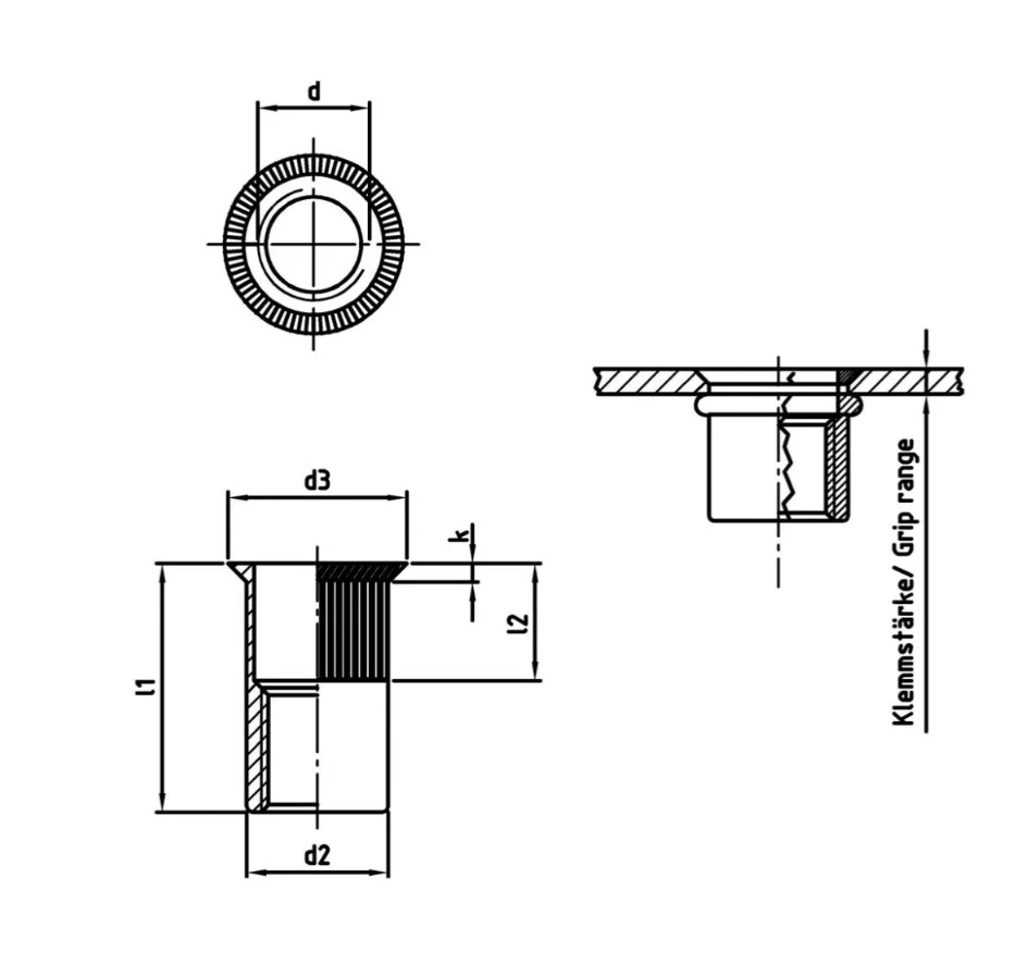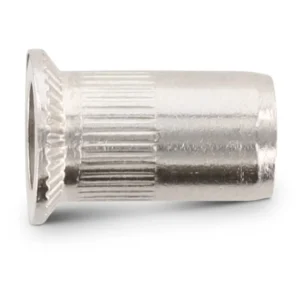- Цилиндрическое тело с насечками: Продольное рифление на корпусе заклепки гарантирует высокую сопротивляемость крутящему моменту, предотвращая проворачивание метиза в отверстии при монтаже и последующей эксплуатации.