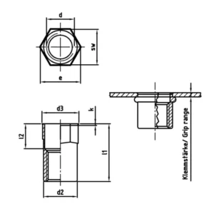| d | d2, мм | d3, мм | l2, мм | k, мм | e, мм | sw, мм | l1, мм | рекомендуемая толщина крепления, мм |